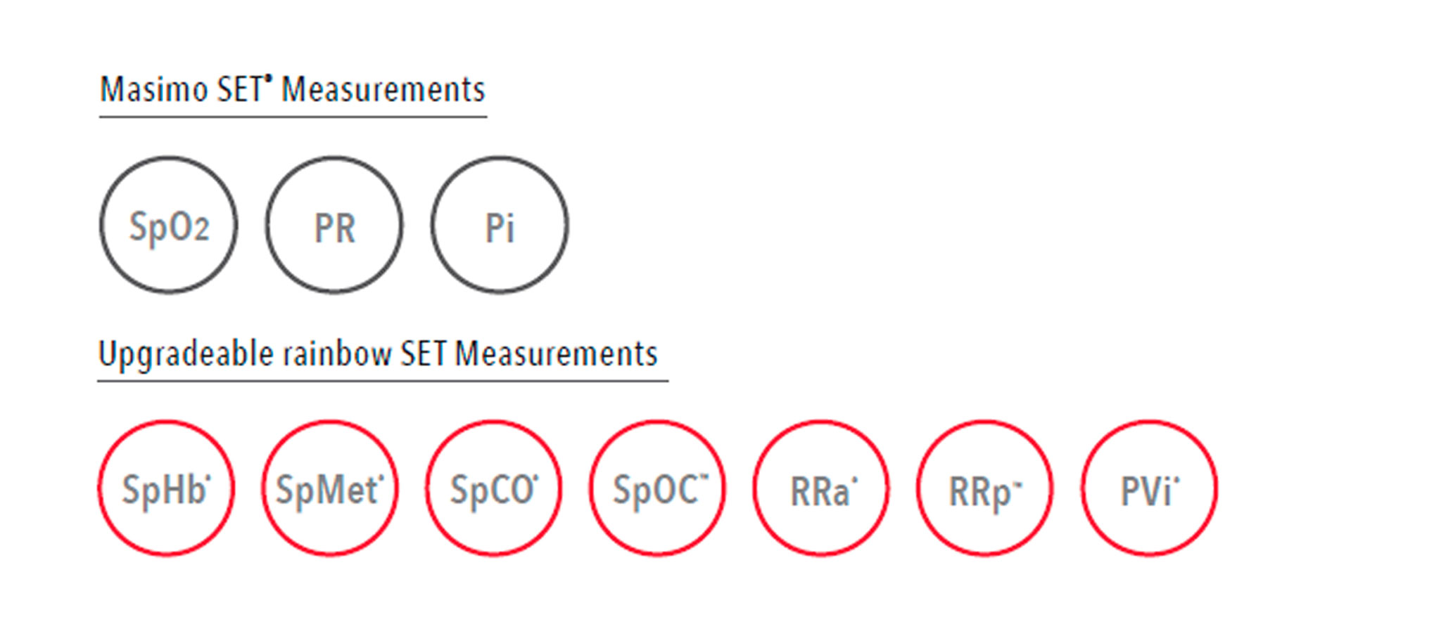 Masimo SET® Measure-through Motion y Low Perfusion ™ Oximetría de pulso con tecnología rainbow SET ™ actualizable